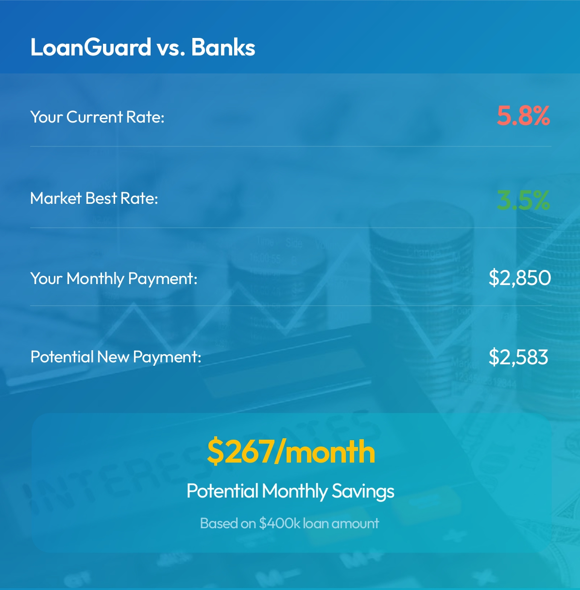 Our system continuously tracks your loan performance against current market rates, alerting you the moment better deals become available.
